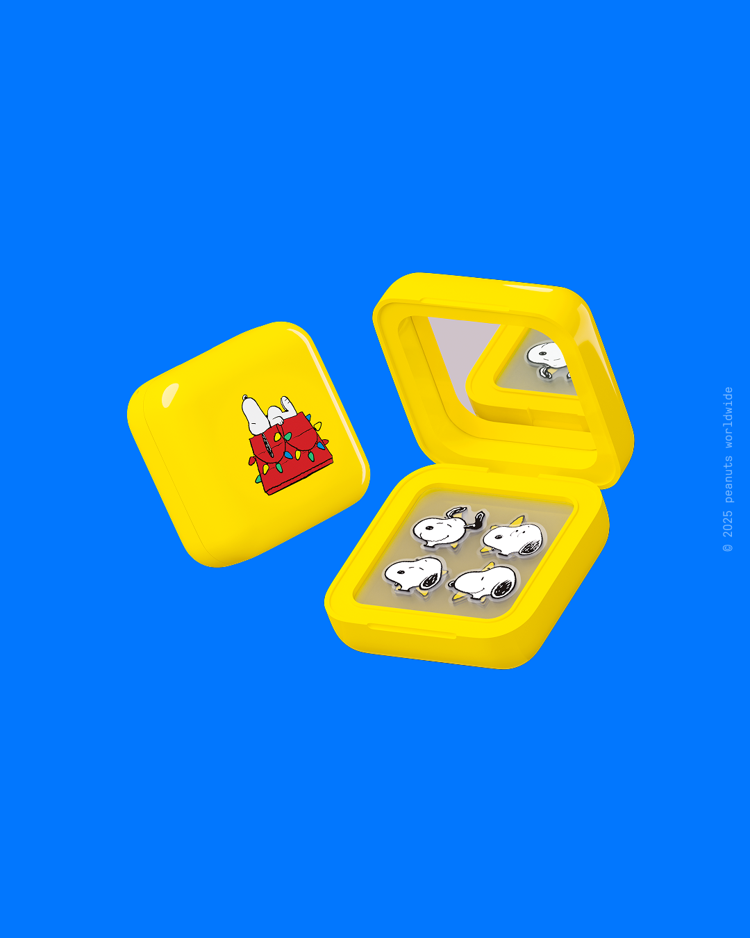 new peanuts x starface is here! inside this cute refillable compact you’ll find 32 hydrocolloid pimple patches featuring four snoopy faces and yellow star doodles.