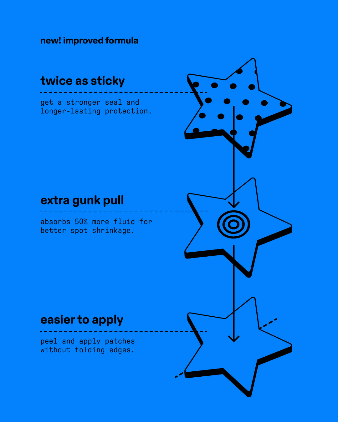 perfectly shaped to hug the curves of your face, hydro-stars are designed to really stick. they shield spots from outside bacteria and serve as a gentle reminder to avoid skin picking.
