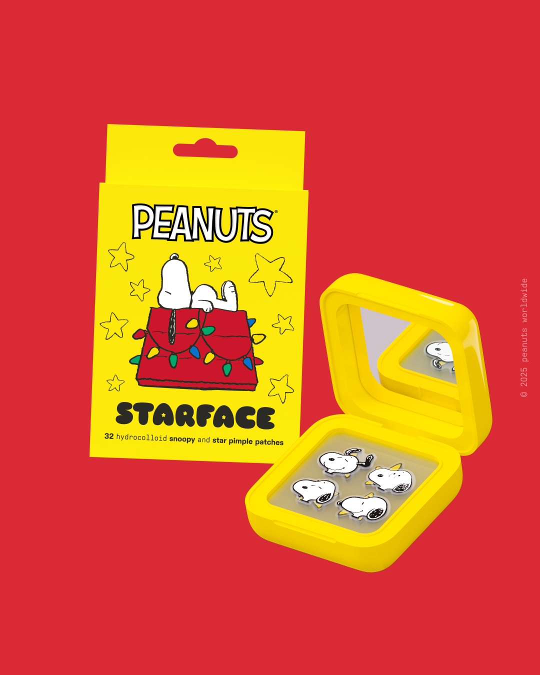 new peanuts x starface is here! feel cute and cozy when you bundle a refill pack and collectible compact featuring four snoopy faces and yellow star doodles. made with 100% hydrocolloid, snoopy pimple patches absorb fluid, shrink spots, and protect your skin.